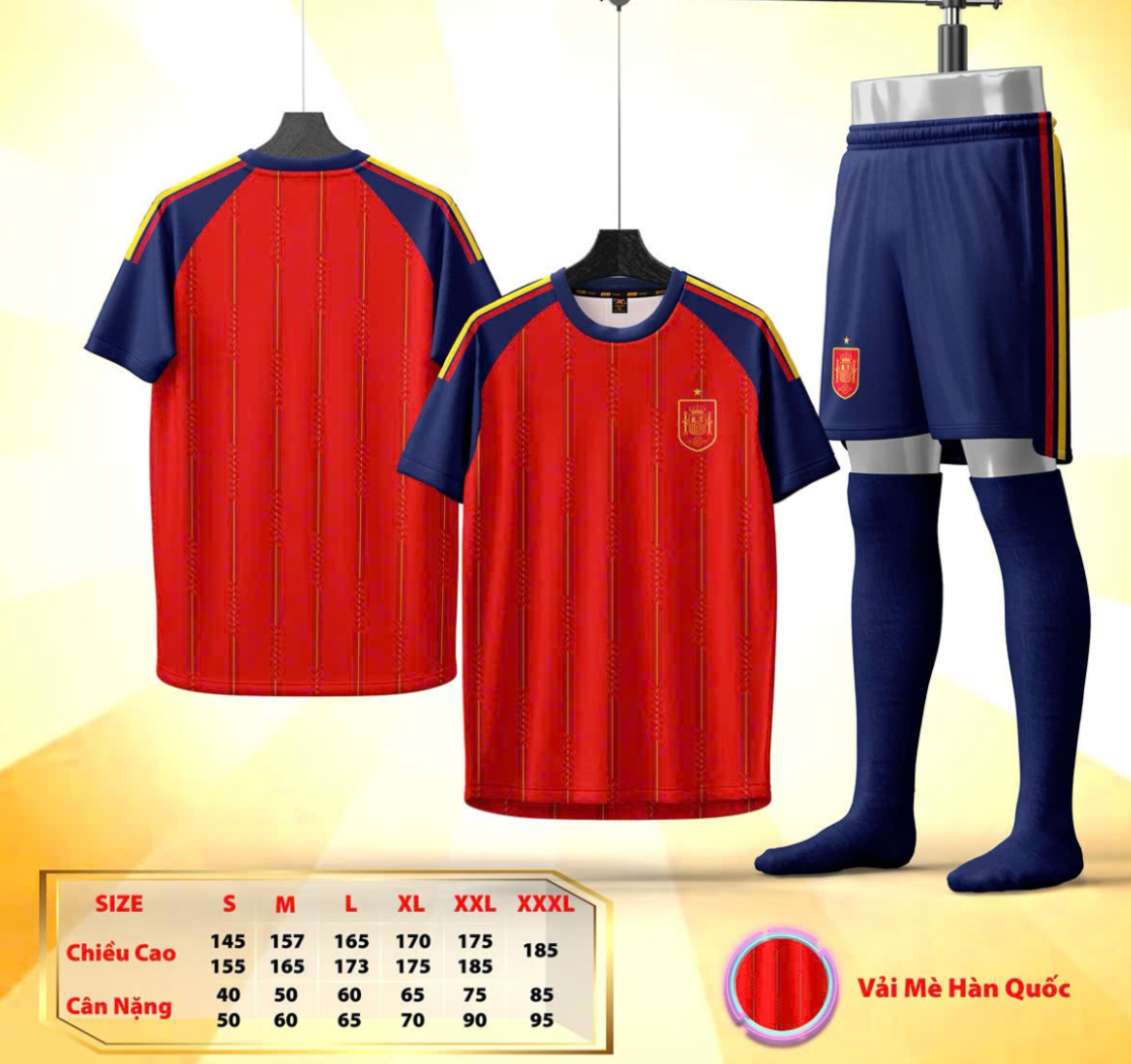 Điểm nhấn nằm ở các mảng họa tiết mang hơi hướng sáng tạo, tạo cảm giác trẻ trung và khác biệt nhưng vẫn giữ nét “chuẩn đội tuyển”. Logo tuyển Tây Ban Nha được in rõ nét, kết hợp cùng chi tiết vai đặc trưng giúp tổng thể trông gọn gàng, thể thao và chuyên nghiệp.